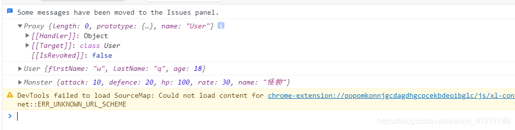 //创建用户类class User {    //对于写个给太麻烦了    // constructor(firstName,lastName,age) {    //     this.firstName=firstName;    //     this.lastName=lastName;    //     this.age=age;    // }}/** * 直接对构造函数进行代理 * @param Class 对象 * @param propNames 对应构造函数的参数 * @returns {any} * @constructor */function ConstructorProxy(Class, ...propNames) {    return new Proxy(Class, {        construct(target, argumentsList) {            const obj = Reflect.construct(target, argumentsList)            propNames.forEach((name, i) => {                obj[name] = argumentsList[i];            })            return obj;        }    })}const UserProxy = ConstructorProxy(User, "firstName", "lastName", "age")console.log(UserProxy)const obj = new UserProxy("w", "q", 18);console.log(obj)//创建Monster类class Monster {}const MonsterProxy = ConstructorProxy(Monster, "attack", "defence", "hp", "rate", "name")const m = new MonsterProxy(10, 20, 100, 30, "怪物")console.log(m);
